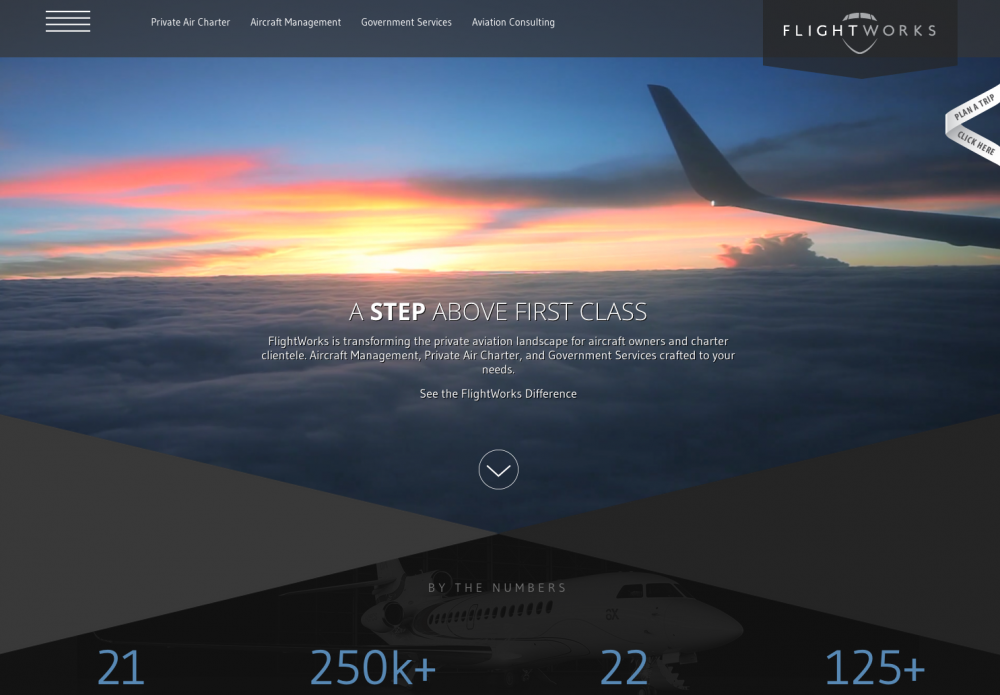 This was a website redesign for our friends at FlightWorks, giving them an updated, fresher look from the original design. We worked closely with the private aviation company to assess their needs and the look they wanted, developing an all-new custom website that was visually appealing and effective. FlightWorks is a private air charter and also offers aircraft management, government services, and aviation consulting services. With a flawless record, they exceed the highest safety standards and have a diverse fleet of turbojet and turboprop aircraft. We wanted the company of exceptional quality to have a website of exceptional quality.